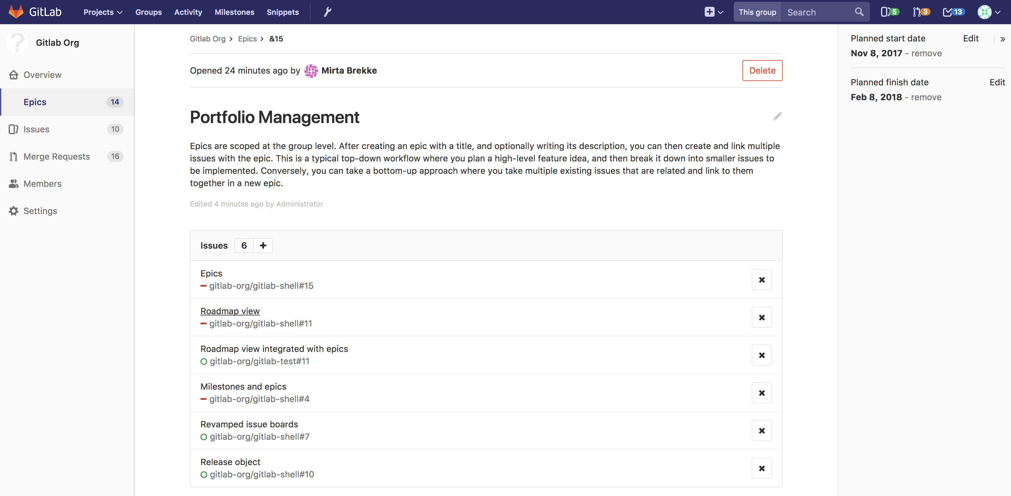 When creating an epic, you only specify its title. For existing epics, you can add/change its title, description, planned start date, and planned end date. The planned end date cannot be before the planned start date (but they can be the same day).